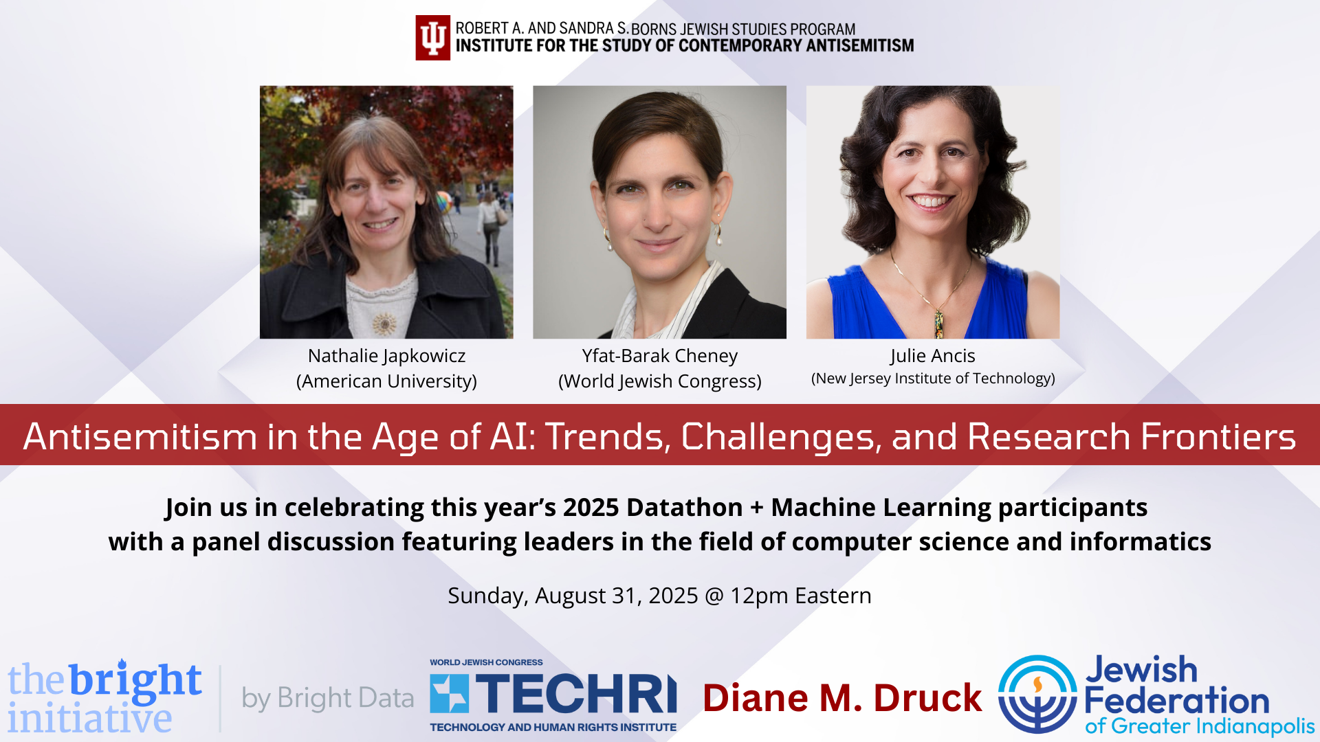 We gratefully acknowledge our partners and sponsors — The Bright Initiative by Bright Data, Indiana University, World Jewish Congress, TECHRI – Technology and Human Rights Institute, Jewish Federation of Greater Indianapolis, and Diane M. Druck — all of whom made this competition possible.